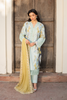 Maya features a light blue hue with a subtle yellow pattern. It is paired with a flowing yellow chiffon dupatta and soft blue trousers, presenting a polished and refreshing ensemble.