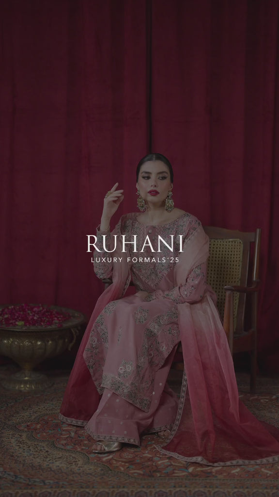 A pink-hued silhouette detailed with ornate embroidery, finished with embellished trousers and an ombre dupatta— a look that beautifully balances heritage and modernity.