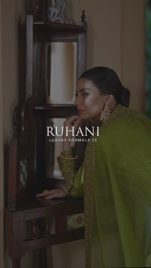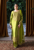 A luminous chartreuse silhouette detailed with embroidery on the sleeves, hem and sleeves, paired with matching trousers and a stunning embroidered dupatta — a perfect balance of vibrance and poise.