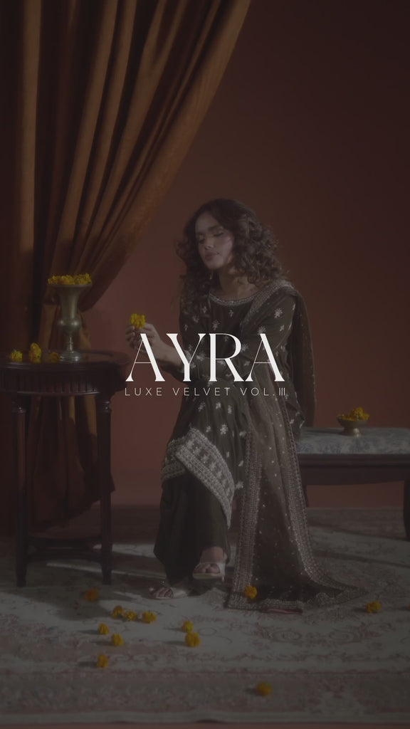 A beautifully crafted outfit, alive with delicate sequin and tilla details, radiating quiet charisma and effortless charm, paired seamlessly with velvet palazzo pants and an embroidered organza dupatta that completes the ensemble with subtle grace and refined poise.