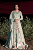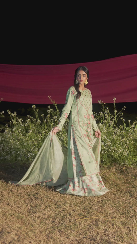 A refreshing sage green ensemble that exudes effortless elegance, featuring a beautifully embroidered shirt adorned with delicate detailing and refined artistry. Paired with a flowing sharara that adds graceful movement and completed with a printed silk dupatta that drapes with a soft sheen, this look reflects timeless charm and graceful allure.