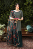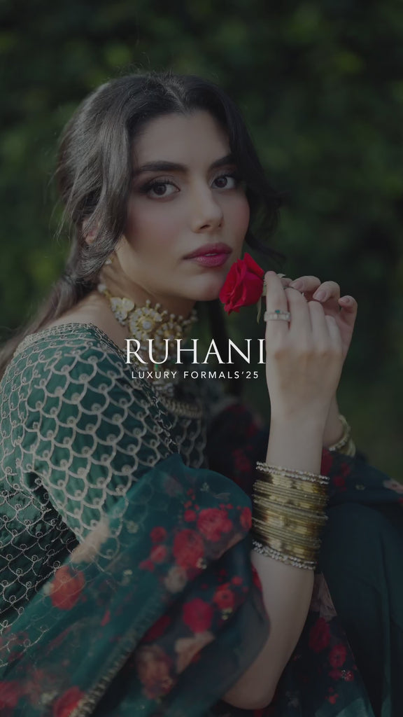 An enchanting bottle-green ensemble layered with fine embroidery, paired with matching shalwar and a sheer printed dupatta blooming with sequins — a composition that feels rich, graceful, and effortlessly poised.