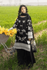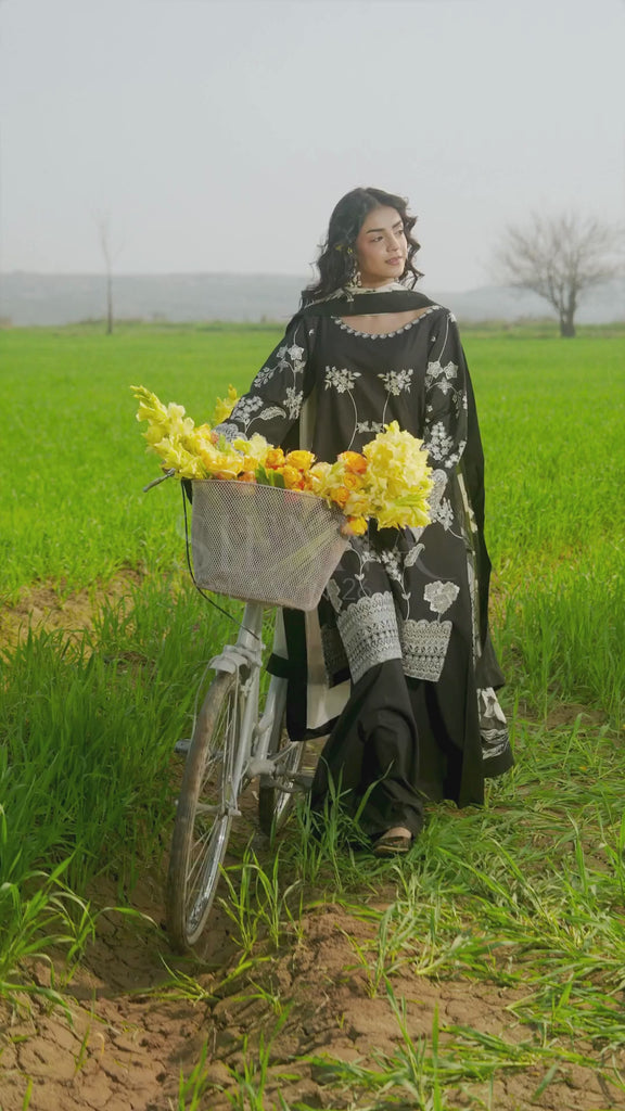 A striking black ensemble with exquisite white floral embroidery, paired with sleek trousers. The look is beautifully completed with a flowing printed silk dupatta, creating a harmonious balance of textures and ornate details — a refined composition of artistry and effortless charisma.